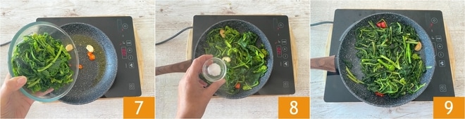 Lorsque l'ail sera bien doré, ajoutez les brocoli-rave 7, ajustez le sel 8 et faites-les sauter à feu moyen-vif pendant une dizaine de minutes 9. Éteignez le feu et servez.