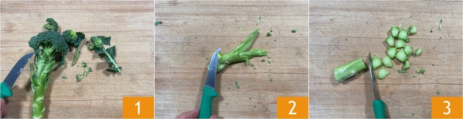 Pour préparer les brocolis à la poêle, commencez par nettoyer le brocoli. Séparez les fleurettes de la tige et mettez-les de côté 1. Épluchez la tige du brocoli en retirant les parties les plus coriaces 2 et coupez-la en fines rondelles 3.