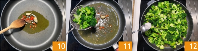 Laissez frire pendant 3 minutes, jusqu'à ce que les anchois soient fondus 10. Ajoutez maintenant les brocolis blanchis 11 et assaisonnez avec du sel fin 12.