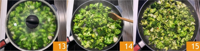Couvrez et faites cuire à feu moyen pendant environ 7 minutes 13. Au bout de ce temps, retirez le couvercle et faites dorer les brocolis pendant encore 8 minutes 14. Lorsqu'ils auront une belle coloration dorée, vos brocolis à la poêle sont prêts à être servis 15 !