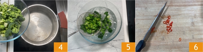 Plongez les brocolis dans de l'eau bouillante et laissez-les 3 minutes 4. Au bout de ce temps, transférez-les immédiatement dans de l'eau glacée 5, afin de conserver leur couleur verte naturelle 5. Pendant ce temps, coupez le piment frais en fines rondelles, en retirant les graines pour un plat moins piquant 6.