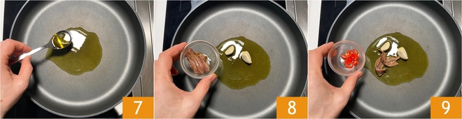 Faites chauffer une poêle antiadhésive et versez l'huile d'olive extra vierge 7. Préparez une base de cuisson avec deux gousses d'ail, des filets d'anchois à l'huile 8 et le piment en rondelles 9.