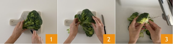 Pour préparer les brocolis à la poêle, commencez par détacher la tige, dont nous n'avons pas besoin, 1 des têtes 2 : au total, vous devriez obtenir environ 425 grammes de brocolis. Rincez les têtes sous un jet d'eau fraîche 3.