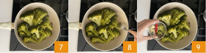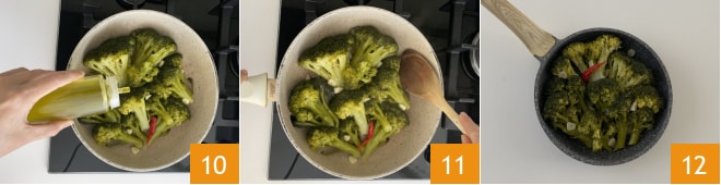 versez l'huile d'olive extra vierge 10 et laissez imprégner à feu vif pendant 2-3 minutes de chaque côté 11. Vos brocolis à la poêle sont prêts, dégustez-les chauds ou froids 12.