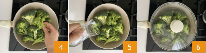 Mettez les brocolis dans une poêle 4 et versez l'eau 5, couvrez avec un couvercle et portez à ébullition 6.