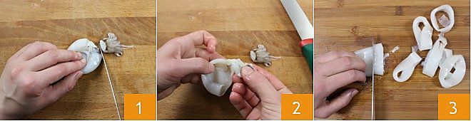 Pour préparer le brodetto fanese, commencez d'abord par nettoyer les poissons. Nettoyez les seiches en séparant la tête du corps 1, éviscérez-les 2 et si elles sont petites, laissez-les ainsi, sinon coupez-les en morceaux. Nettoyez de la même manière le calamar et coupez le corps en rondelles 3.