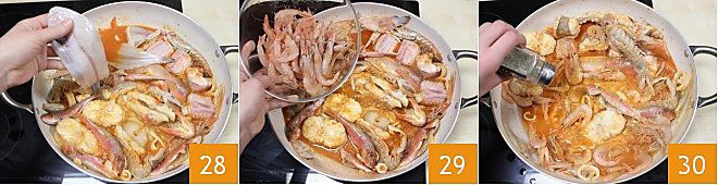 les soles 28 et enfin les crevettes 29. Faites cuire encore pendant 10 minutes au maximum, puis salez, poivrez 30 et voilà, le brodetto fanese est prêt ! Servez-le avec des croûtons de pain grillé au four ou avec des tranches de pain frais!