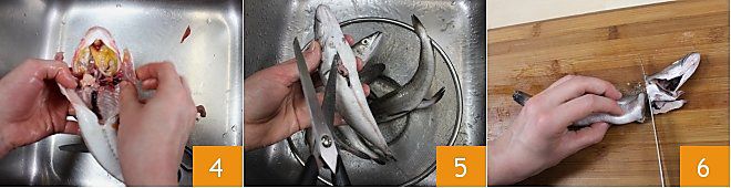 Laissez entière la grondin et éviscérez-la sous l'eau courante 4; Faites de même avec le merlu : ouvrez le ventre et éviscérez-le 5. Puis éliminez la tête 6; s'il est très grand, coupez-le en morceaux, sinon laissez-le entier.