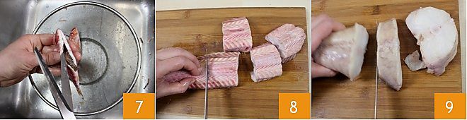 Éviscérez également les rougets et laissez-les entiers 7. Maintenant, coupez en morceaux à la fois la roussette et la lotte à laquelle vous aurez enlevé la peau, qui se trouvent déjà nettoyées dans le commerce (8-9).