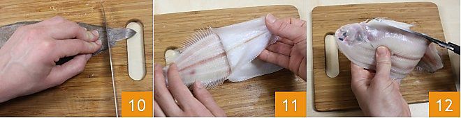 Nettoyez la sole : incisez la peau de la queue avec un couteau 10 et tirez-la avec force 11 des deux côtés. Avec les ciseaux, éliminez les arêtes externes 12. Pour plus de détails, regardez la École de Cuisine : nettoyer la sole.