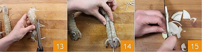 Enfin, occupez-vous des crustacés : enlevez les petites pattes des cigales de mer et incisez-les au centre à partir de la tête (13-14). Faites de même avec les langoustines si vous le souhaitez, afin de faciliter leur consommation une fois cuites. À ce stade, procédez avec le brodetto : hachez l'oignon 15 et