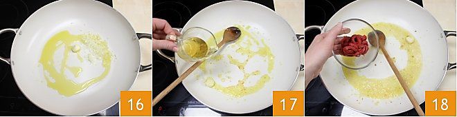 faites-le revenir dans une bonne quantité d'huile avec une gousse d'ail, que vous pouvez laisser entière ou écraser 16, à feu très doux pendant 15 minutes. Déglacez avec le vinaigre de vin blanc (ou un autre vinaigre, l'important est qu'il soit délicat) 17 et, une fois que le vinaigre s'est évaporé, ajoutez le concentré de tomates 18.