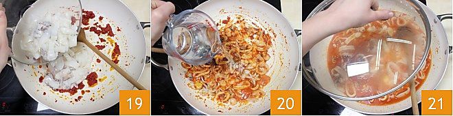 Maintenant que la base est prête, vous pouvez ajouter les poissons, en commençant par ceux qui nécessitent une cuisson plus longue : les seiches et les calmars 19 que vous ferez revenir pendant environ 10 minutes. Ajoutez ensuite de l'eau chaude 20 (ou du Fumet de poisson ou du fumet de crustacés si vous en avez à disposition) et couvrez avec un couvercle 21.