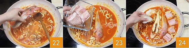 Ajoutez maintenant dans la casserole les poissons principaux : la grondin 22, la roussette 23, la queue de lotte 24 et enfin le merlu. Ne remuez plus avec une cuillère en bois à partir de maintenant, mais secouez seulement la casserole par les poignées.