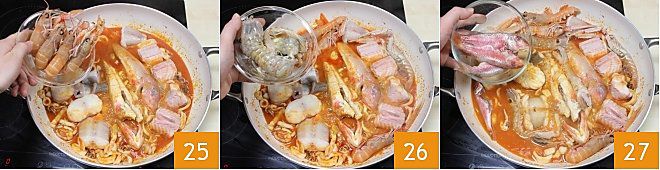 Ajoutez enfin les crustacés et les rougets, qui nécessitent peu de cuisson : les langoustines 25, les cigales de mer 26 et les rougets entiers 27,