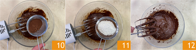 Éteignez le fouet et tamisez le cacao 10 et la farine 11. Incorporez les ingrédients secs avec le fouet jusqu'à obtenir une pâte lisse et homogène 12.