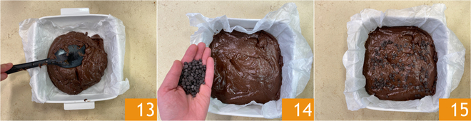 Versez le mélange dans un moule de 20x20 cm tapissé de papier sulfurisé mouillé et essoré 13. Nivelez la surface et parsemez de pépites de chocolat 14. Placez le moule dans le panier de la friteuse à air et faites cuire pendant 30 minutes à 160° en mode pâtisserie 15 (nous avons utilisé une friteuse d'une capacité de 6 litres).