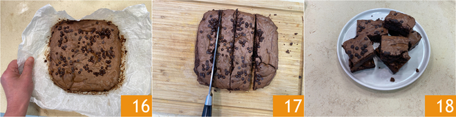 Une fois le temps de cuisson écoulé, sortez le dessert 16 et retirez le papier sulfurisé. Laissez tiédir, puis coupez le brownie en carrés 17. Vos brownies à la friteuse à air sont prêts à être dégustés seuls ou avec une pincée de sucre glace 18 !
