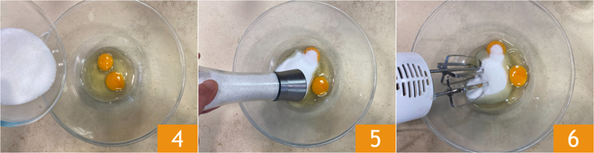 Dans un grand bol, versez les œufs et le sucre 4, ajoutez une pincée de sel 5 et battez avec un fouet électrique 6.