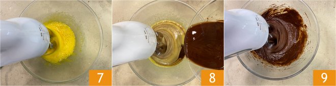 En environ 10 minutes, vous obtiendrez un mélange clair et mousseux 7, puis incorporez le mélange tiède de chocolat et de beurre 8 et mélangez pendant quelques minutes avec le fouet 9.