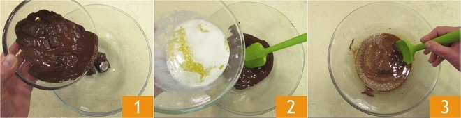 Pour réaliser les brownies, commencez par hacher et faire fondre le chocolat noir au bain-marie ou au micro-ondes et versez-le dans un bol 1. Faites également fondre le beurre et ajoutez-le au chocolat fondu 2, puis mélangez vigoureusement avec une maryse 3 et laissez tiédir.