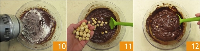 Incorporez les poudres avec les fouets jusqu'à obtenir une pâte lisse et homogène 10. À ce stade, ajoutez les noisettes grillées 11 et incorporez-les avec une maryse 12.