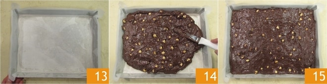 Tapissez un moule de 21x28 cm de papier sulfurisé 13, versez la pâte à l'intérieur et nivelez-la uniformément 14. Faites cuire au four statique à 180°C pendant 25 minutes 15.
