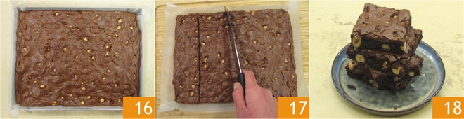 Après le temps de cuisson, sortez du four et laissez refroidir complètement 16, puis divisez en carrés 17. Vos brownies sont prêts à être dégustés 18 !