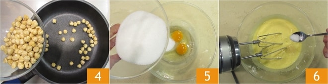 Entre-temps, faites griller les noisettes dans une poêle 4 et réservez-les. Dans un grand bol, versez les œufs et le sucre 5, puis battez-les avec un batteur électrique en ajoutant également le sel 6.