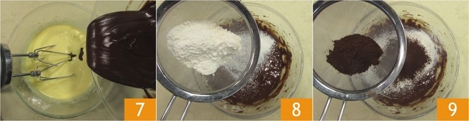Lorsque vous obtenez un mélange clair et mousseux, ajoutez le mélange de chocolat et beurre tiédi 7 et mélangez pendant quelques minutes avec les fouets. Enfin, tamisez la farine 8 et le cacao dans le bol 9.
