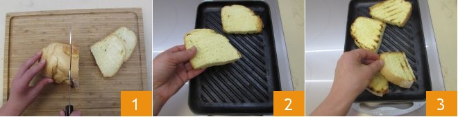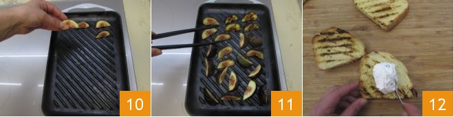 Disposez‑les sur le gril bien chaud 10 : faites‑les cuire quelques secondes de chaque côté en veillant à les retourner avec des pinces de cuisine 11. Maintenant tout est prêt pour composer les bruschette. Prenez une tranche de pain, étalez‑y la crème de robiola et de ciboulette 12.