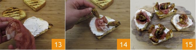 Déposez deux fines tranches de jambon cru au centre de la tranche de pain 13 et autour des tranches de figue 14. Répétez l'opération pour les autres tranches de pain. Votre bruschetta aux figues et jambon cru doux est maintenant prête à être servie 15 !
