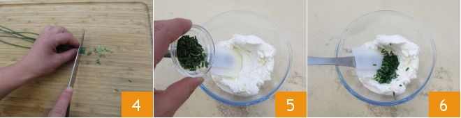 Occupez‑vous maintenant de la crème au fromage. Rincez la ciboulette et hachez‑la finement 4. Mélangez‑la dans un bol avec la robiola 5 et homogénéisez bien les ingrédients 6.