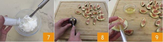 Ajustez en sel et poivre 7 et réservez. Passez à la préparation des figues : rincez‑les, coupez‑les en deux puis chaque moitié en trois 8. Badigeonnez‑les de miel sur toute la surface 9.
