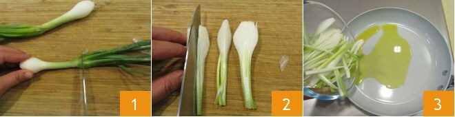 Pour préparer les bruschettes brunch, commencez par nettoyer les oignons nouveaux : coupez la partie verte 1, puis divisez chaque oignon en deux et coupez chaque moitié en 3 parties 2. Dans une poêle, chauffez un filet d'huile d'olive, ajoutez les oignons 3,
