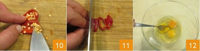 retirez les graines 10 et émincez-le finement 11, mettez-le aussi de côté et occupez-vous des œufs : dans un bol, battez les œufs entiers avec du sel et du poivre 12