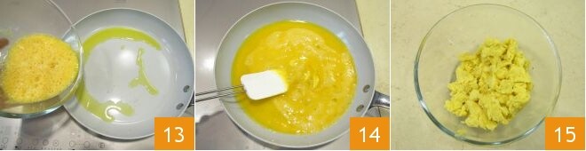 chauffez un filet d'huile dans une poêle et versez les œufs battus 13, faites cuire à feu modéré pendant quelques minutes et mélangez pour les brouiller 14. Lorsqu'ils commencent à prendre, vous pouvez également éteindre le feu : la chaleur de la poêle suffira pour continuer la cuisson. Une fois prêts, ils ne doivent pas être liquides mais ne doivent pas non plus avoir une consistance trop cuite : ils doivent avoir une couleur homogène, une texture douce et légèrement granuleuse. Transférez-les ensuite dans un bol 15.