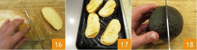 Tranchez le pain 16 pour obtenir des tranches de 2 cm d'épaisseur, huilez légèrement une plaque et, lorsqu'elle est bien chaude, toastez les tranches de pain pendant 2 minutes de chaque côté. Pour finir, occupez-vous de l'avocat : coupez-le en deux 18