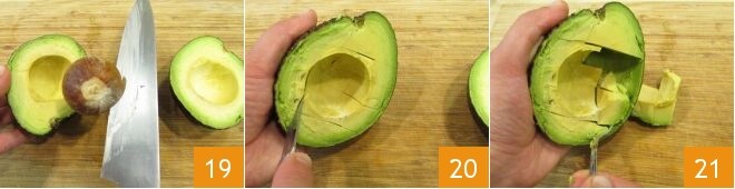 Retirez le noyau avec un couteau 19, avec un petit couteau, incisez la chair en horizontal et en vertical 20, cela vous permettra de retirer la chair plus facilement avec une cuillère 21.