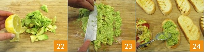 Rassemblez la chair sur une planche à découper, assaisonnez-la avec du jus de citron pour éviter qu'elle ne noircisse 22. Coupez finement la chair de l'avocat avec un couteau, en essayant de réaliser une crème en écrasant la purée d'avocat en aplatissant la lame sur la planche à découper, afin d'obtenir une purée 23. Tout est prêt pour composer la bruschetta brunch : prenez une tranche de pain toasté, étalez dessus la purée d'avocat 24