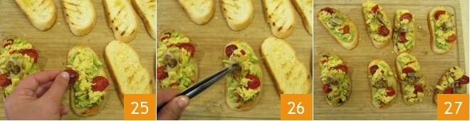 Répartissez également l'œuf brouillé, les tomates rôties 25 et les oignons mijotés 26, terminez en aromatisant avec les tranches de piment. Vos bruschettes brunch sont prêtes à être servies à table 27