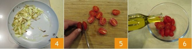 salez, poivrez et faites-les mijoter pendant 6-7 minutes 4 et mettez-les de côté. Lavez les tomates cerises (il vous en faudra 8), coupez-les en deux 5, assaisonnez-les avec de l'huile 6, du sel et du poivre
