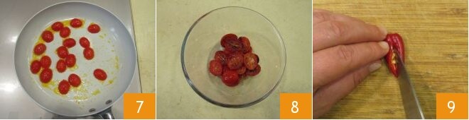 faites-les rôtir dans la même poêle où vous avez fait revenir les oignons 7, puis mettez-les dans un bol 8. Occupez-vous maintenant du piment frais : coupez-le en deux 9