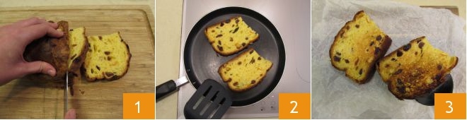 Pour réaliser les bruschettes de panettone au gorgonzola, commencez par couper le panettone restant en tranches épaisses 1. Chauffez une plaque et toastez les tranches de panettone pendant quelques instants 2, juste le temps de les faire dorer 3.