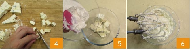 Enlevez la croûte du gorgonzola, coupez-le en cubes et placez-le dans un bol, ajoutez le mascarpone 4 et travaillez les fromages avec un batteur électrique à basse vitesse pour obtenir une crème épaisse 5. Étalez la crème sur les tranches de panettone grillées en utilisant une spatule 6.