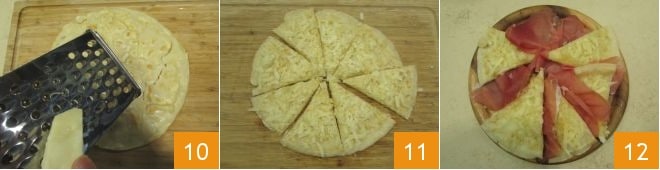 et parsemez immédiatement la surface avec le pecorino râpé 10. Coupez-le en 8 morceaux 11 et servez-le encore chaud accompagné du jambon cru de Norcia : votre brustengo est prêt à être dégusté 12 !