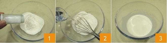 Pour réaliser le brustengo, commencez par préparer la pâte : versez la farine dans un bol et ajoutez une pincée de sel 1, puis versez l'eau en filet tout en mélangeant avec un fouet pour éviter la formation de grumeaux 2 jusqu'à obtenir un mélange fluide et homogène 3.