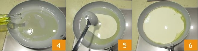 Placez une poêle antiadhésive d'environ 25 cm de diamètre sur le feu, chauffez l'huile d'olive extra vierge 4 et ajoutez le mélange de farine et d'eau avec une louche 5 ; répartissez uniformément la pâte sur toute la surface et faites cuire à feu moyen pendant environ 10 minutes 6.