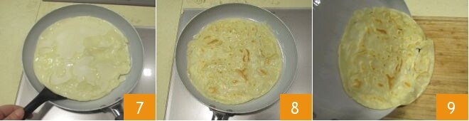 Après 10 minutes, soulevez délicatement les bords avec une spatule pour vérifier que le côté inférieur est cuit 7, puis retournez le brustengo et faites-le cuire de l'autre côté pendant 4-5 minutes 8. Une fois cuit, transférez le brustengo sur une planche à découper 9