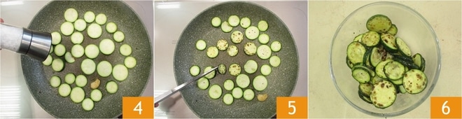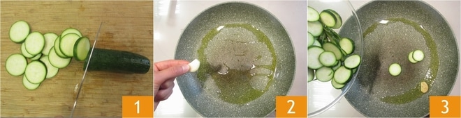 Pour réaliser les bucatini crémeux aux courgettes et à la menthe, commencez par équeuter les courgettes et les couper en rondelles 1. Dans une poêle, faites revenir une gousse d'ail pelée avec un filet d'huile 2, puis ajoutez les courgettes 3.